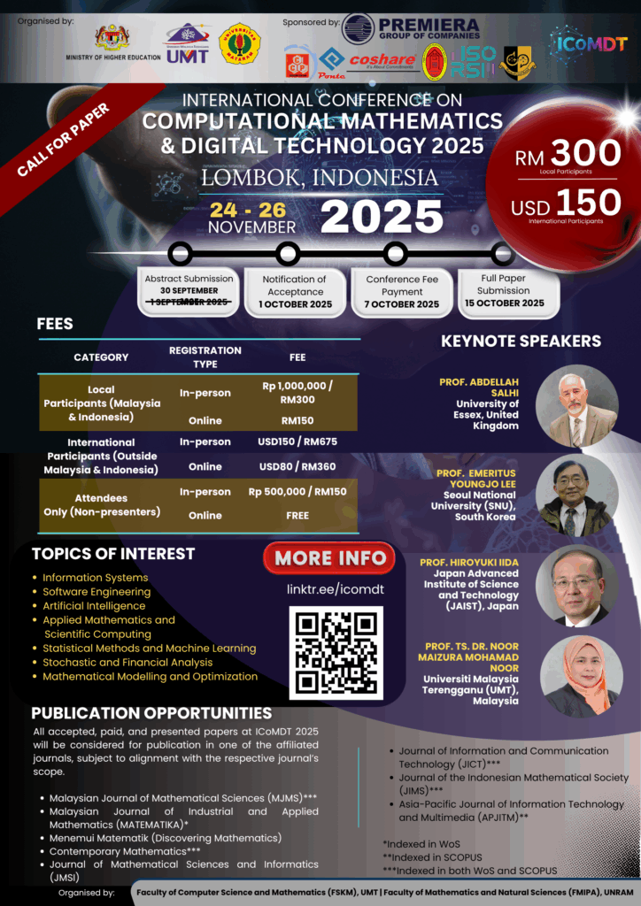 Jointly organized by the Faculty of Computer Science and Mathematics (FSKM), Universiti Malaysia Terengganu (UMT) and the Faculty of Mathematics and Natural Sciences (FMIPA), Universitas Mataram (UNRAM), this conference serves as a vibrant platform for global scholars and practitioners to connect, collaborate, and share groundbreaking research at the intersection of mathematics, computer science, and emerging digital technologies.